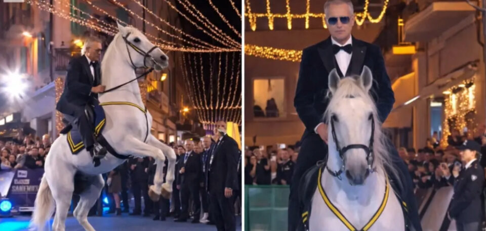 Μια εντυπωσιακή και πρωτότυπη εμφάνιση έκανε ο διεθνούς φήμης Ιταλός τενόρος Αντρέα Μποτσέλι στο φεστιβάλ του Σαν Ρέμο, καθώς προσήλθε στη σκηνή έφιππος πάνω σε λευκό άλογο, σε μια στιγμή που ξεχώρισε στην 76η διοργάνωση του ιστορικού μουσικού θεσμού