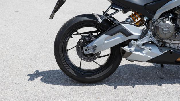 Για το σύστημα πέδησης έχει φροντίσει η Brembo, με 2 ακτινικά τοποθετημένες, τετραπίστονες δαγκάνες εμπρός σε δίσκους 320 χλστ. και μία μονού εμβόλου πίσω σε δίσκο 220 χλστ. Ακτινική και ρυθμιζόμενη είναι επίσης η μανέτα του φρένου, ενώ το σύστημα διαθέτει σωληνάκια υψηλής πίεσης. Η προσοχή της Aprilia στη λεπτομέρεια και η επιθυμία της να εξοπλίσει το μοντέλο με Premium περιφερειακά, υπογραμμίζεται και από τα ελαστικά Pirelli Rosso IV σε διαστάσεις 120/70-17 εμπρός και 180/55-17 πίσω, που ταιριάζουν απόλυτα με τον χαρακτήρα του.