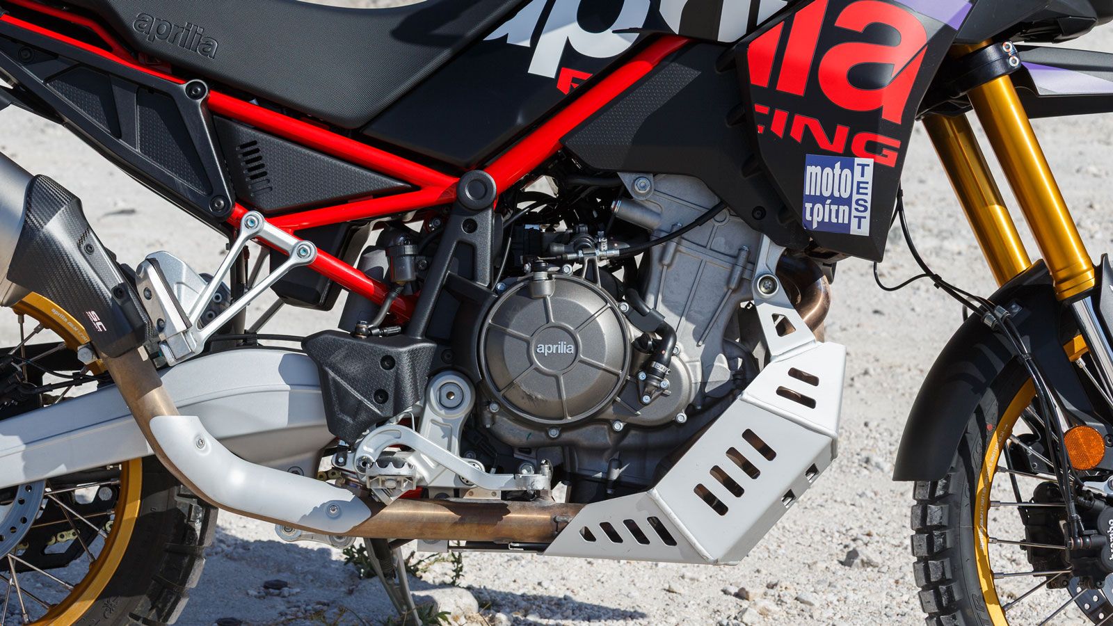 Έχοντας πλέον δοκιμάσει εκτενώς τον δικύλινδρο εν σειρά κινητήρα 659 κ.εκ. της Aprilia σε κάθε μορφή του, η ελαστικότητά και η αξιοπιστία του είναι δεδομένες. Για να πληροί λοιπόν τα Euro5+ πρότυπα έχει δεχθεί μικρές αλλαγές μεγάλης σημασίας, χωρίς να χάσει ουγγιά τσαγανού. Διατηρεί δηλαδή την μέγιστη απόδοση 80 ίππων στις 9.250 σ.α.λ. και τα 70 Nm ροπής στις 6.500 σ.α.λ. Αποκτά νέα, μεγαλύτερα σώματα ψεκασμού 52χλστ έναντι 48χλστ και χάρη στο ραφινάρισμα του συστήματος Ride by Wire έχει βελτιωθεί η απόκριση γκαζιού σε όλο το φάσμα των στροφών. Στο ελαφρύτερο βολάν υπάρχουν νέα υλικά με σπάνιες γαίες, έτσι ώστε να έχει μειωμένη αδράνεια, διευκολύνοντας την ανύψωση του εμπρός τροχού για το ξεπέρασμα εμποδίων. Με το νέο τελικό εξάτμισης της SC Project αναδεικνύεται ο απολαυστικός ήχος που προσδίδει στον κινητήρα ο στρόφαλος με διαστήματα ανάφλεξης 270° (που θυμίζει V2), ενώ δεν είναι τόσο δυνατός όσο θα περιμέναμε, παραμένοντας φιλικός και καθόλου ενοχλητικός στις καθημερινές μετακινήσεις και στον αυτοκινητόδρομο. Η σουίτα ηλεκτρονικών APRC σου επιτρέπει να παραμετροποιήσεις το TCS σε 4 επίπεδα, το φρένο κινητήρα σε 3 και να απενεργοποιήσεις το ABS, ενώ υπάρχουν 4 διαφορετικά Riding Modes (urban, explore, off road, individual). Φυσικά παραμένει το Cruise Control με την χρήση του οποίου μετρήσαμε την κατανάλωση του μοντέλου στα 4,7 λτ./100 χλμ. στο ταξίδι. Σε μικτές συνθήκες έκαψε 5,7 λτ./100 χλμ. και σε συνδυασμό με το ρεζερβουάρ 18 λίτρων η αυτονομία του θα ξεπεράσει τα 310 χιλιόμετρα σε κάθε σενάριο, αρκετά για να εξερευνήσεις άγνωστα μονοπάτια.