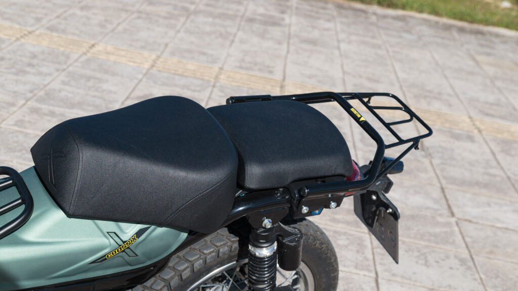 Η σέλα είναι χωρισμένη σε δύο επίπεδα, με το εμπρός τμήμα να ανασηκώνεται για τον ανεφοδιασμό καυσίμου, μια λύση απλή και πρακτική. Και οι δύο θέσεις, οδηγού και συνεπιβάτη είναι άνετες για την κατηγορία, ακόμη και σε μεγαλύτερες διαδρομές από όσες θα περίμενε κανείς από ένα παπί. Τα μαρσπιέ οδηγού και συνεπιβάτη διαθέτουν λάστιχο και δοντάκια, στοιχείο που ενισχύει τη συμπεριφορά εκτός δρόμου.