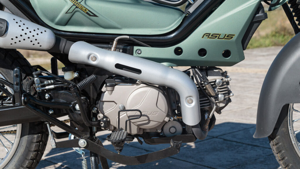 Το ASUS Cross X 125 εξοπλίζεται με μονοκύλινδρο, τετράχρονο, αερόψυκτο, διβάλβιδο κινητήρα κυβισμού 124,9 κ.εκ. Ο κινητήρας χρησιμοποιεί σύστημα ψεκασμού EFI, εξασφαλίζοντας συμμόρφωση με τις σύγχρονες προδιαγραφές Euro5+. Ο κινητήρας συνεργάζεται με κιβώτιο 4 σχέσεων και χρησιμοποιεί φυγοκεντρικό σύστημα συμπλέκτη, όπως στα κλασικά παπιά, χωρίς μανέτα συμπλέκτη. Η διάταξη αυτή επιτρέπει τις αλλαγές ταχυτήτων χωρίς χειρισμό συμπλέκτη, διατηρώντας τη γνώριμη φιλοσοφία της κατηγορίας. Η μετάδοση πραγματοποιείται μέσω κιβωτίου 4 σχέσεων τύπου μύλου με στοπ στην τέταρτη για να μην υπάρχουν ευτράπελα εν κίνηση και η τελική μετάδοση είναι με αλυσίδα.
