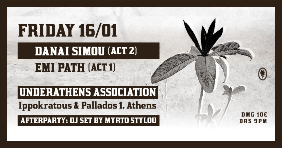 Την Παρασκευή 16/01/2026, η Danai Simou και η Emi Path θα παρουσιάσουν μια βραδιά πλημμυρισμένη από σκοτεινούς τόνους στο Underathens Association προσφέροντας μια έντονη ηχητική εμπειρία. Ένα οπτικοακουστικό κάλεσμα, μια κατάδυση στο κόσμο τους και μια διαδρομή προς τον πυρήνα μας.