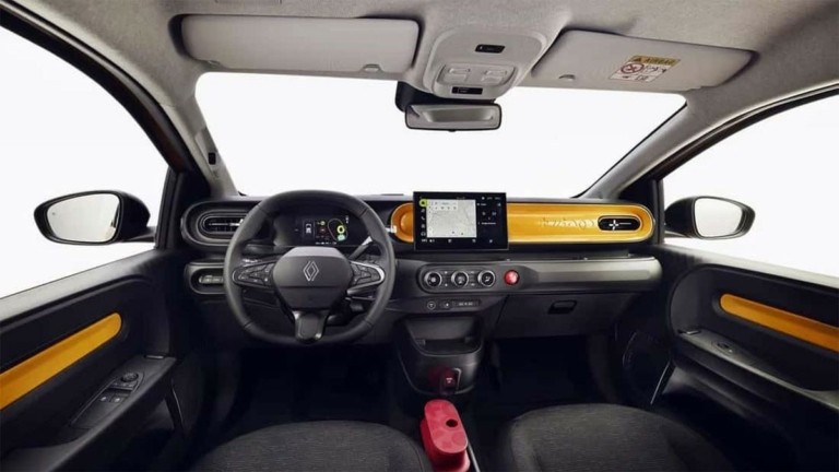 Το εσωτερικό, που αποκαλύφθηκε για πρώτη φορά στις Βρυξέλλες στις αρχές του 2025, υιοθετεί επίσης στοιχεία από το πρώτο Twingo.