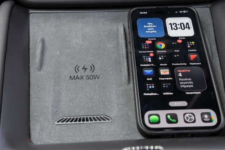 Στην κονσόλα υπάρχουν επιφάνεια για την τοποθέτηση δύο smartphones (η μία επιτρέπει και την επαγωγική φόρτισή τους με ισχύ έως 50 W) και ο κομψός μικρός μοχλός με «κρυστάλλινη» εμφάνιση για την επιλογή της φοράς κίνησης του οχήματος.