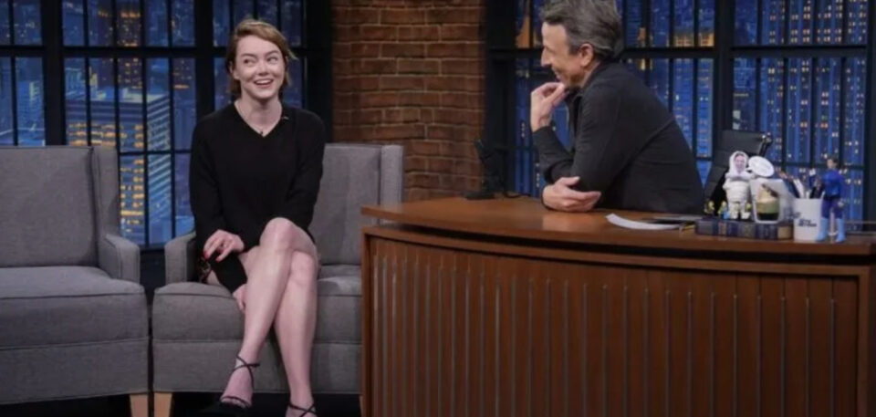 Στο πλαίσιο της προώθησης της «Βουγονίας», η Emma Stone έδωσε μια νέα τηλεοπτική συνέντευξη στον Seth Meyers, όπου κλήθηκε να σχολιάσει μια αστεία στιγμή της ταινίας σε σκηνοθεσία Γιώργου Λάνθιμου, στην οποία ο χαρακτήρας της απάγεται από δύο άλλους (Jessie Plemons, Aidan Delbis) οι οποίοι φορούν μάσκες της Jennifer Aniston. «Τις έχουν αγοράσει από ένα κατάστημα» λέει η πρωταγωνίστρια. «Είναι μια στιγμή που σε αιφνιδιάζει και σε τρομάζει γιατί αναρωτιέσαι τι είναι αυτές οι μάσκες. Αυτό δεν είναι σπόιλερ: Συμβαίνει στην αρχή της ταινίας».