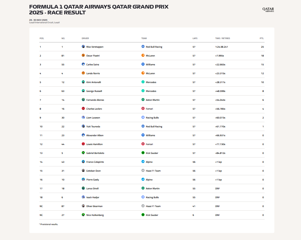 Δεύτερος τερμάτισε ο Πιάστρι ο οποίος είναι πια στην τρίτη θέση του πρωταθλήματος, 16 βαθμούς πίσω από τον Νόρις και 4 πίσω από τον Φερστάπεν. Τρίτος τερμάτισε ο Σάινθ ο οποίος έπειτα από μία μεγάλη εμφάνιση χάρισε στην Williams το δεύτερο φετινό της podium. Ο τέταρτος στο Κατάρ, Νόρις θα πρέπει να κερδίσει τους Φερστάπεν και Πιάστρι σε μία εβδομάδα από σήμερα. Ραντεβού στο Άμπου Ντάμπι!