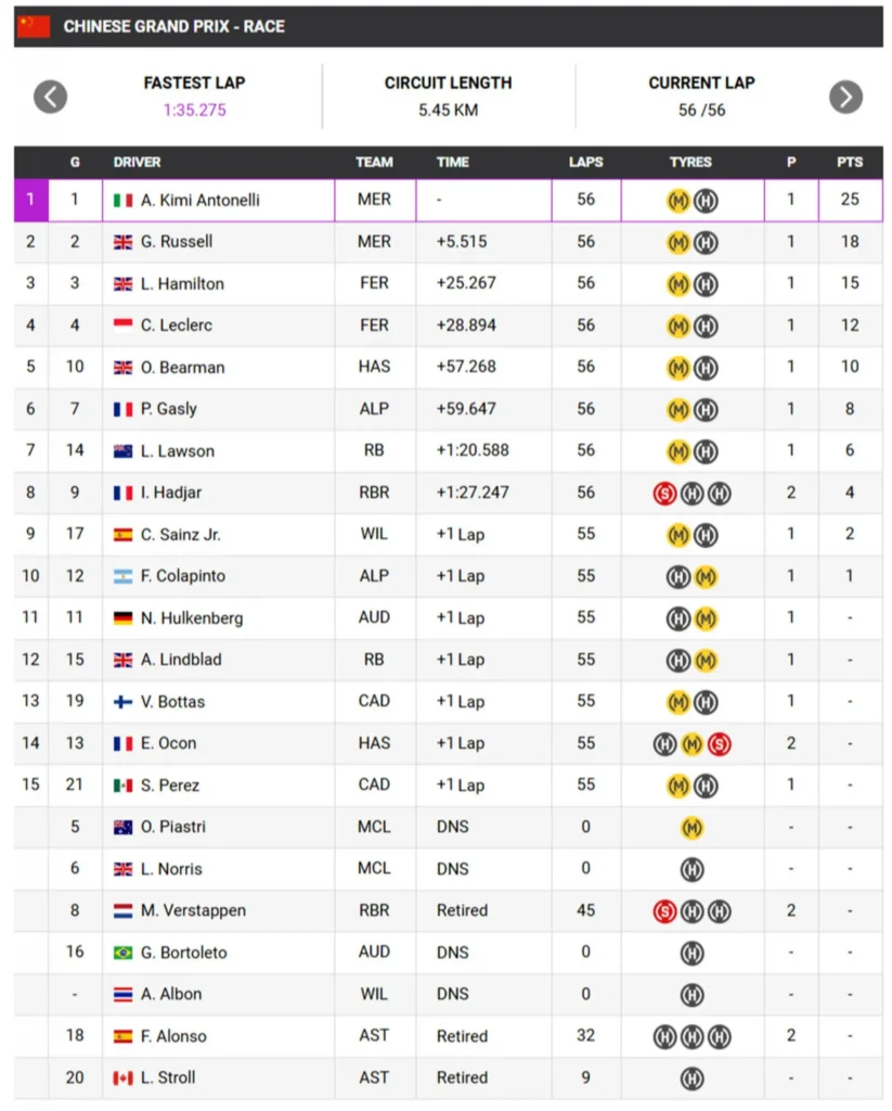 Η Ιταλία έχει και πάλι νικητή. Ο Κίμι Αντονέλι κυριάρχησε στην Κίνα και έγινε ο πρώτος Ιταλός που κερδίζει GP από τον Φιζικέλα στην Μαλαισία του 2006. Πρώτο podium του Χάμιλτον με την Ferrari.