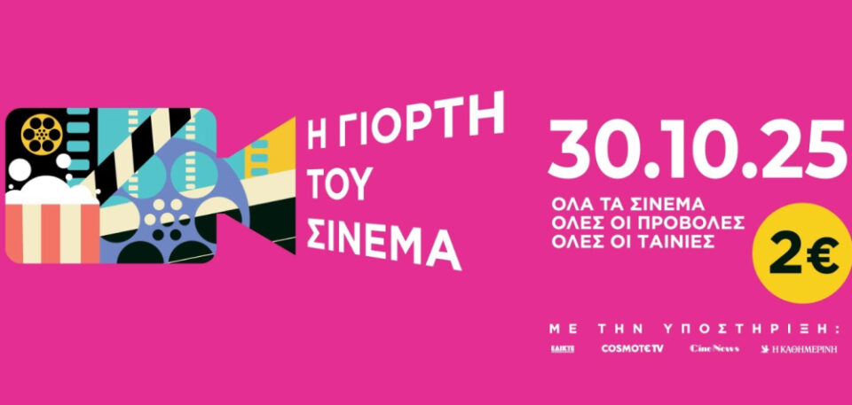 Η πιο αγαπημένη κινηματογραφική παράδοση επιστρέφει. Την Πέμπτη 30 Οκτωβρίου, η Γιορτή του Σινεμά 2025 μετατρέπει ολόκληρη τη χώρα σε μια τεράστια κινηματογραφική αίθουσα, με ενιαίο εισιτήριο 2 ευρώ για όλες τις προβολές, σε όλες τις αίθουσες και για όλες τις ταινίες.