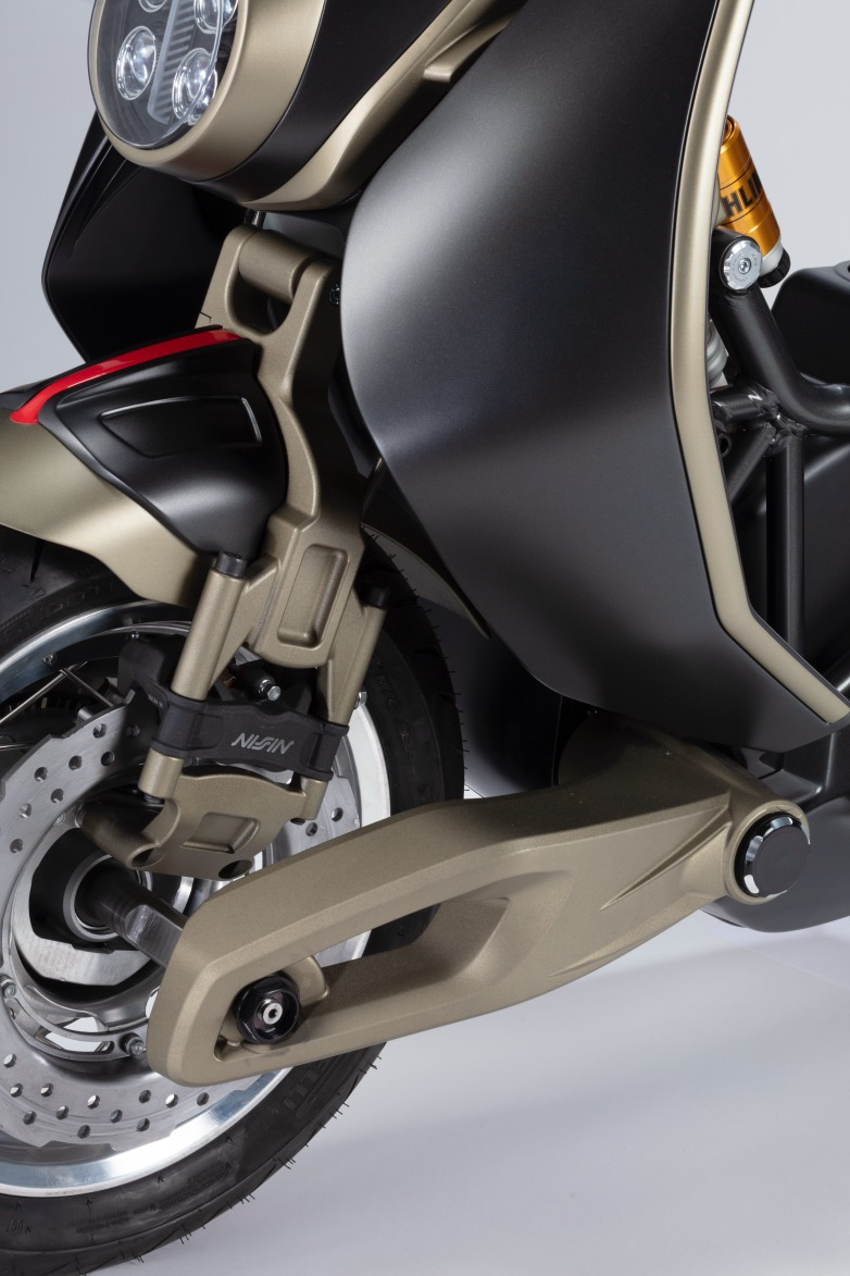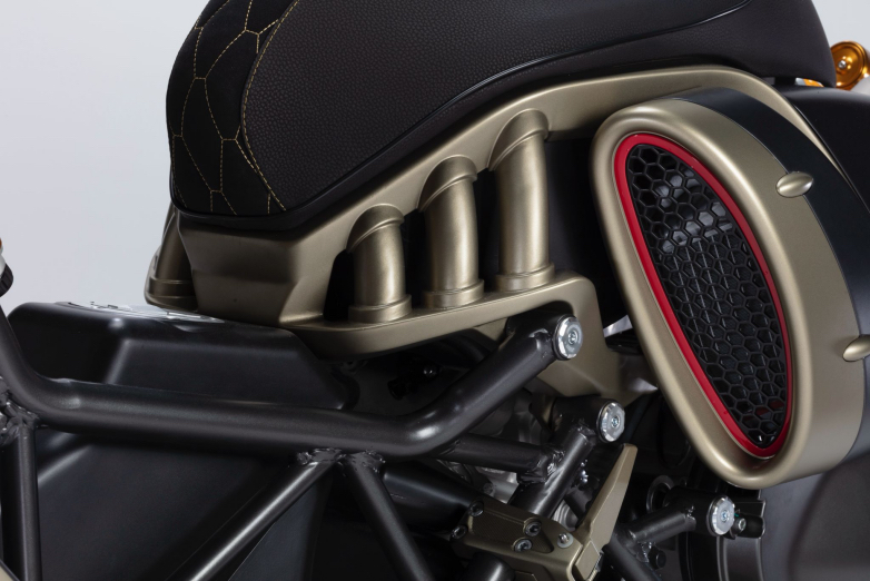 Από τις αλουμινένιες ζάντες με ακτίνες, μέχρι το ορατό πλαίσιο κάτω από τη σέλα -εμπνευσμένο από τις πολλαπλές εισαγωγές αέρα κινητήρων υψηλών επιδόσεων- και την διπλή εξάτμιση Akrapovič που πλαισιώνει το κεντρικό πίσω αμορτισέρ, κάθε λεπτομέρεια έχει σμιλευθεί για να τραβά τα βλέμματα.