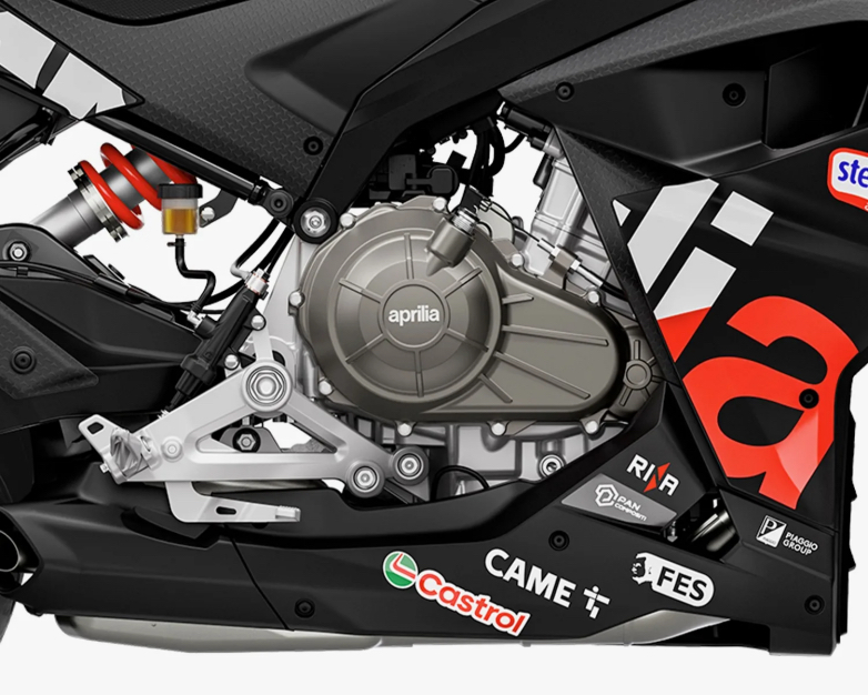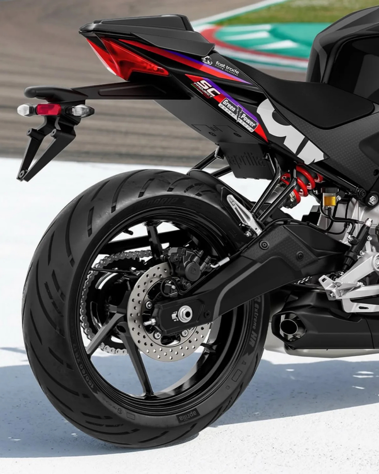 Ουσιαστικά, η Aprilia κάνει τη μικρή RS να μοιάζει σαν να ανήκει στα paddock του MotoGP. Παίρνει τα πλήρη γραφικά εμπνευσμένα από το MotoGP, αλλά δεν πρόκειται μόνο για αυτοκόλλητα. Το πλαίσιο, το ψαλίδι και η πάνω τιμονόπλακα είναι βαμμένα μαύρα, κάτι που της δίνει αμέσως πιο σοβαρή εμφάνιση. Έπειτα υπάρχει και το μονόσελο κάλυμμα, που καταργεί κάθε ιδέα ότι προορίζεται για δύο άτομα. Παραμένει η ίδια φιλική πλατφόρμα από κάτω, αλλά εμφανισιακά «ντύνεται» σαν την αγωνιστική μοτοσυκλέτα του MotoGP και αυτό της ταιριάζει.
