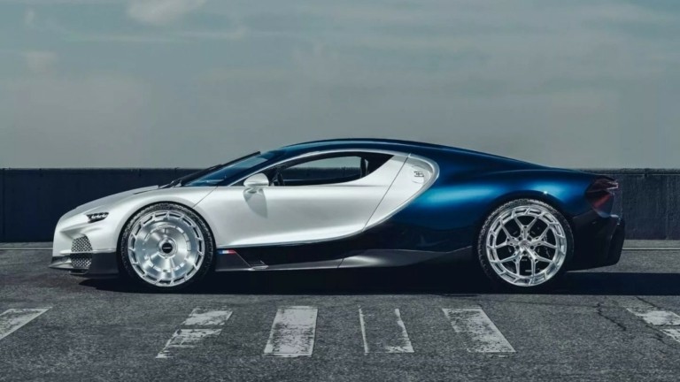 Στις ψηφιακές απεικονίσεις του σχεδιαστή Karan Adivi, η Bugatti Tourbillon εμφανίζεται με ασημί και μπλε χρωματισμό, που αναδεικνύει ιδανικά τις ακραία αεροδυναμικές γραμμές της.