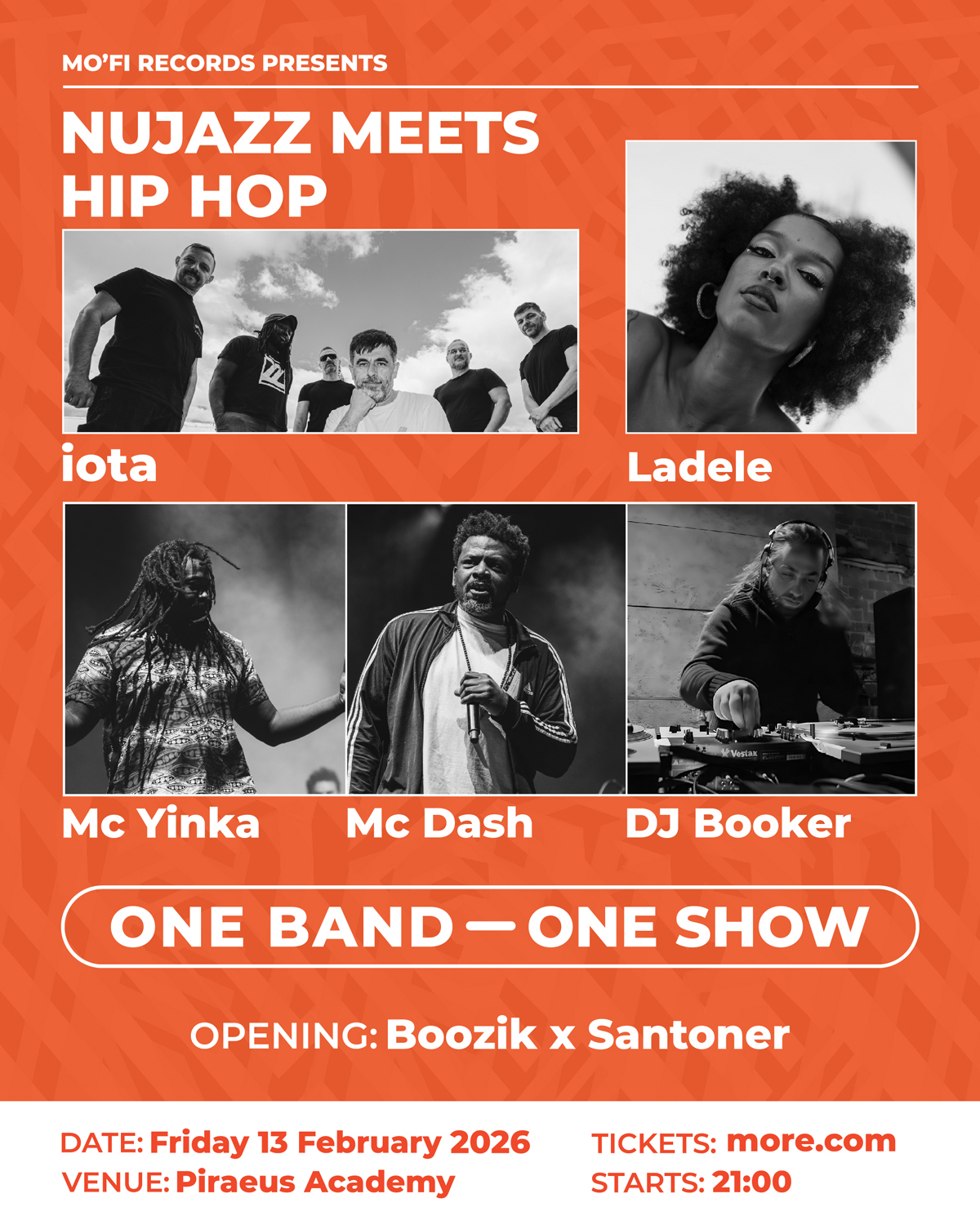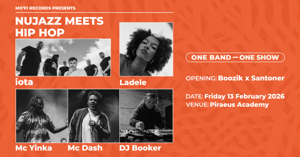 Η MO’FI Records παρουσιάζει: Nu jazz meets hip hop: One Band, One Show, με τους iota, Ladele, Urban Lynx (MC Yinka και MC Dash) και DJ Booker να μοιράζονται στη σκηνή του Piraeus Academy ως μία ενιαία μπάντα, παρουσιάζοντας ένα δυναμικό concept live που συνδυάζει nu jazz, hip hop, live instruments, ηλεκτρονικά layers και turntablism και ενώνει διαφορετικούς μουσικούς κόσμους, με grooves, φωνητικά, rap, αυτοσχεδιασμούς και δυνατή ενέργεια πάνω στη σκηνή.