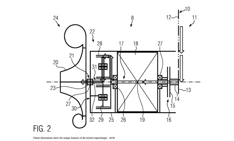 Το δίπλωμα ευρεσιτεχνίας της KTM δείχνει ένα ηλεκτρικά υποβοηθούμενο μηχανικό σύστημα υπερτροφοδότησης, που τοποθετείται ιδανικά ανάμεσα σε αυτό της Ninja H2 και στο πλήρως ηλεκτρικό V3R. Ο υπερσυμπιεστής κινείται από τον στρόφαλο της μοτοσυκλέτας ενώ ταυτόχρονα, υπάρχει ένας μικρός ηλεκτρικά ελεγχόμενος συμπλέκτης που αποσυνδέει τον συμπιεστή από τον στρόφαλο και σε αυτή την περίπτωση, ένας ηλεκτροκινητήρας αναλαμβάνει την περιστροφή του.