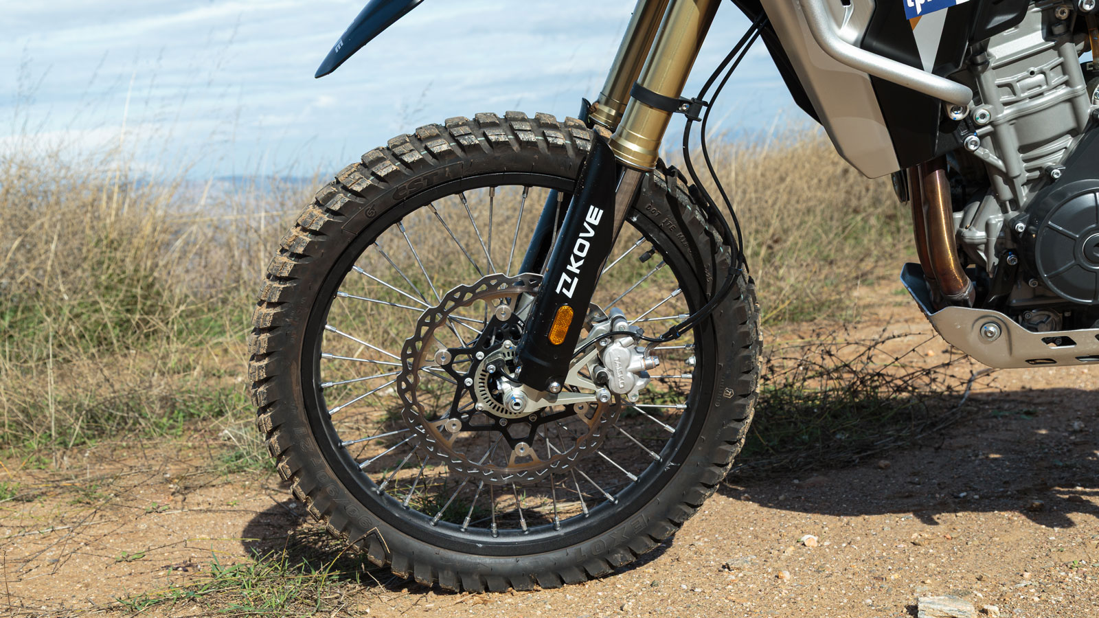 Από μεριάς αναρτήσεων έχουμε ένα ανεστραμμένο πιρούνι Twin Chamber 49 χιλιοστών της Yuan με ρυθμιζόμενη απόσβεση επαναφοράς και συμπίεσης και ένα πλήρως ρυθμιζόμενο monoshock αμορτισέρ της ίδιας εταιρείας πίσω, που εδράζεται σε μοχλικό κι έχει ρύθμιση low-high speed της συμπίεσης. Οι διαδρομές τους είναι στα 270 και 250 χιλιοστά αντίστοιχα και δίνουν στη μοτοσυκλέτα το εντυπωσιακό νούμερο των 293 χιλιοστών ελάχιστης απόστασης από το έδαφος. Στο σύστημα πέδησης συναντάμε έναν δίσκο 310 χιλιοστών εμπρός με διπίστονη δαγκάνα της Taisko και έναν δίσκο 240 χιλιοστών πίσω, με δαγκάνα μονού εμβόλου της ίδιας εταιρείας. Η μοτοσυκλέτα διαθέτει φυσικά δικάναλη μονάδα ABS, της οποίας η λειτουργία μπορεί να απενεργοποιηθεί και στους 2 τροχούς (ή μόνο πίσω). Οι τροχοί 21 και 18 ιντσών εμπρός-πίσω, έχουν ενισχυμένες ακτίνες και αλουμινένια στεφάνια, ενώ ντύνονται με τα CST CM-EX01 ως ελαστικά πρώτης τοποθέτησης (με ψηλό τακούνι και αρκετά επιθετικό προφίλ) σε διαστάσεις 90/90-21 και 140/80-18.