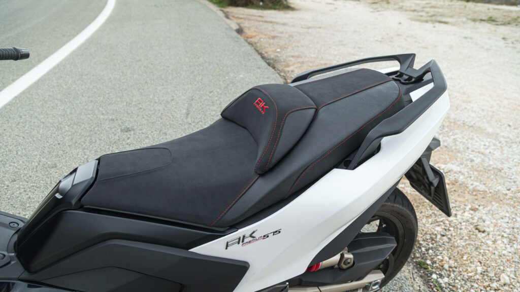 Η φαρδιά σέλα και οι μεγάλες κεκλιμένες πλατφόρμες παρέχουν άπλετο χώρο για να τοποθετήσεις τον κορμό και τα άκρα σου στο επιθυμητό σημείο. Μπορείς μάλιστα να ρυθμίσεις και το μαξιλαράκι της πλάτης ώστε να πειραματιστείς με την GT εργονομία του ΑΚ 575, ενώ η άνεση περισσεύει σε κάθε περίπτωση. Εκ πρώτης όψεως, η σέλα μοιάζει flat αλλά το αφρώδες της δεν κουράζει ακόμα και μετά από συνεχόμενη πολύωρη χρήση, ενώ παρά το ύψος των 790 χιλιοστών και το φαρδύ κεντρικό τούνελ στενεύει στο εμπρός της μέρος για να διευκολύνει την πρόσβαση των πελμάτων στο έδαφος. Ο συνεπιβάτης κάθεται λίγο ψηλότερα στο δικό του εξίσου ευρύχωρο παρόμοιας σκληρότητας κομμάτι και χάρη στις πρακτικές χειρολαβές και τη φυσιολογική γωνία των γονάτων, θα ακολουθήσει ευχάριστα ακόμα και σε μεγαλύτερες βόλτες ή ταξίδια. Ο αποθηκευτικός χώρος έχει παραμείνει ίδιος και μπορεί να φιλοξενήσει ένα full face κράνος και μερικά πράγματα ακόμη, ενώ έξτρα χώρο προσφέρει το ντουλαπάκι στη δεξιά μεριά της ποδιάς που δεν κλειδώνει, αλλά έχει θύρα USB. Ο πίνακας οργάνων εξακολουθεί να αποτελείται από τρεις ψηφιακές οθόνες οι οποίες φέρουν πλέον τεχνολογία IPS για μειωμένες αντανακλάσεις και μέγιστη ευκρίνεια στην ανάγνωση των πληροφοριών. Από την κεντρική οθόνη έχει αφαιρεθεί το σύστημα διασύνδεσης Noodoe, μπορείς ωστόσο να συνδεθείς με το κινητό σου για λειτουργία πλοήγησης. Όπως μας έχει συνηθίσει το AK, το εξοπλιστικό πακέτο είναι υπερπλήρες και περιλαμβάνει οτιδήποτε μπορεί να διευκολύνει τη ζωή του αναβάτη. Ηλεκτρικά ρυθμιζόμενη ζελατίνα σε εύρος 85 χιλιοστών, θερμαινόμενα γκριπ τριών επιπέδων, cruise control, έλεγχο πίεσης ελαστικών (TPMS), ρυθμιζόμενες μανέτες, χειρόφρενο χειρός και keyless σύστημα τρίτης γενιάς για εκκίνηση και αυτόματο άνοιγμα σέλας, τάπας ρεζερβουάρ και κλείδωμα τιμονιού χωρίς τη χρήση κλειδιού. Οι εργονομικοί διακόπτες δίνουν άμεση πρόσβαση στις επιμέρους λειτουργίες των συστημάτων -μόνο στατική ρύθμιση παραμέτρων- χωρίς περίπλοκες διαδικασίες, με αποκορύφωμα τα χρηστικά πλήκτρα σε στυλ πιάνου κάτω από το τιμόνι.