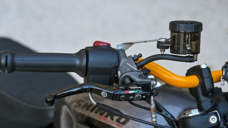 Όσο αφορά στα φρένα τοποθετήθηκε μια 15 χιλιοστών αντλία εμπρός φρένου RCS της Brembo με κοντή μανέτα, ενώ αντικαταστάθηκε και η εμπρός δαγκάνα με μια αντίστοιχη της ιταλικής εταιρίας, που όμως πρώτα βάφτηκε στο κίτρινο χρώμα της Öhlins, όπως και το τιμόνι.