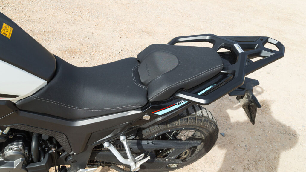 Η Morbidelli T502X έχει σχεδιαστεί με ξεκάθαρη έμφαση στη φυσική και ξεκούραστη θέση οδήγησης, στοιχείο κρίσιμο για μια adventure μοτοσυκλέτα με ταξιδιωτικές βλέψεις. Η όρθια θέση σώματος, σε συνδυασμό με το φαρδύ τιμόνι, τοποθετεί τον αναβάτη σε ελεγχόμενη και χαλαρή στάση, χωρίς να φορτίζονται καρποί ή ώμοι. Η συνολική γεωμετρία είναι φτιαγμένη έτσι ώστε να “κουμπώνει” ο αναβάτης εύκολα, ακόμα και από τα πρώτα χιλιόμετρα.