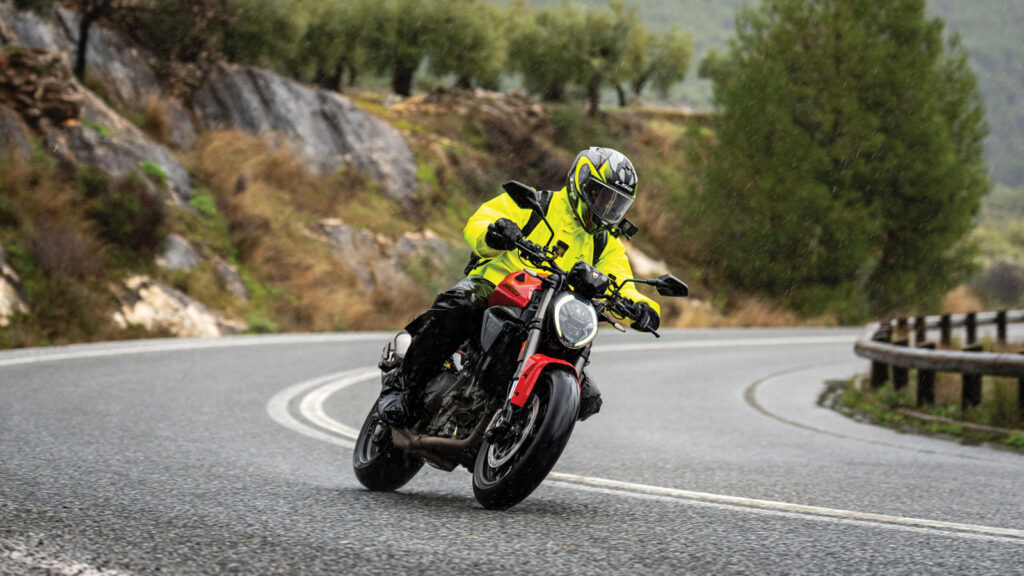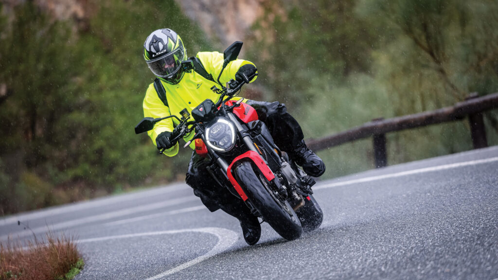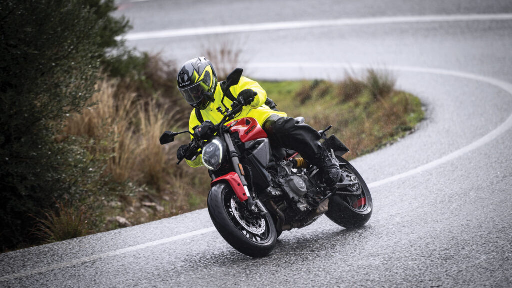 Εκ του προοιμίου όλα μοιάζουν ιδανικά για την Παγκόσμια Παρουσίαση του νέου Monster στη Μάλαγα. Όλα αυτά μέχρι οι ντόπιοι Ισπανοί να μου αναλύσουν γιατί έχω περισσότερες πιθανότητες να πιάσω τους αριθμούς του Τζόκερ από το να πετύχω συνεχόμενες μέρες βροχόπτωσης σε ένα από τα νοτιότερα σημεία της Ευρώπης. Πριν καν στρίψω το κλειδί και φωτιστεί η νέα 5αρα TFT οθόνη με το σχεδιάγραμμα του Monster και τα έγχρωμα γραφικά, η βροχή που έπεφτε ήδη ζωηρά από την προηγούμενη ημέρα, σκέπαζε κάθε σπιθαμή του δρόμου με νερό και αύξανε τη στάθμη στους ήδη τροφαντούς νερόλακκους. Σε τέτοιες συνθήκες όμως δημιουργείται ένα φανταστικό παράθυρό ευκαιρίας να τσεκάρεις την συμπεριφορά και την αποτελεσματικότητα των αναβαθμισμένων ηλεκτρονικών βοηθημάτων. Το πρώτο που βιώνεις έντονα είναι η φιλοσοφία πίσω από την εναλλαγή απόδοσης σε κάθε riding mode και η χρησιμότητα των ήπιων χαρτογραφήσεων. Το rain έχει πάντα λόγο ύπαρξης παρόλο που βρίσκεται ως επί το πλείστον παραγκωνισμένο σε σχέση με τα πιο «ελεύθερα» προγράμματα. Η ροπή δέχεται τα συγχαρητήρια του δεξιού καρπού σε κάθε άνοιγμα του γκαζιού. Μεταξύ 4.000 και 10.000 έχεις συνεχώς διαθέσιμο το 80% αυτής, αποδεικνύοντας την ιδανική διαστρωμάτωση της. Στην πράξη αυτό μεταφράζεται σε καλύτερη απόκριση στις χαμηλομεσαίες, λιγότερη ανάγκη για κατεβάσματα και μεγαλύτερη άνεση σε χαμηλές ταχύτητες ή σε συνθήκες όπως αυτή, βλέπε βροχή. Φυσικά ο Ducati χαρακτήρας του κινητήρα παραμένει ξεκάθαρος και αναλλοίωτος. Ζωηρός, μηχανικός, με ένα έντονο κροτάλισμα του V2 να «ξεβράζεται» στο στήθος σου. Η φαινομενική υποβάθμιση στην χωρητικότητα δεν συνοδεύεται από μείωση της απόδοσης, αφού έχουμε ακριβώς την ίδια ιπποδύναμη. Αυτό όμως που σηματοδοτεί το εξελικτικό σκαλοπάτι στην  5η γενιά, είναι η πιο ώριμη συμπεριφορά του συνόλου. Το προηγούμενο Monster 937 ήταν μια πολύ καλή μοτοσυκλέτα, όμως είχε ένα πιο έντονο, πιο απαιτητικό ταπεραμέντο που θυσίαζε κομμάτια πρακτικότητας. Σε αντιδιαστολή, το νέο Monster επενδύει στην ευκολία και τη φιλικότητα χωρίς να έχει απολέσει ούτε δράμι από τον σπιρτόζικο και διασκεδαστικό χαρακτήρα του. Ο νέος V2 με το μεταβλητό χρονισμό IVT γεμίζει το κενό στις μεσαίες στροφές, κάνει το γκάζι πιο προβλέψιμο και σου επιτρέπει να κινηθείς γρήγορα με λιγότερη προσπάθεια. Η απόκριση είναι άμεση και η επιτάχυνση γεμάτη και ουσιαστική χωρίς ξεσπάσματα. Το πλαίσιο προσφέρει στιβαρότητα αλλά και ζωντανή, άμεση αίσθηση στο τιμόνι. Βλέπεις, τα 175 κιλά είναι νούμερο μαγικό… που μεταφράζεται σε καντάρια ευελιξίας και κινήσεις χειρουργικής ακρίβειας όπου και όποτε ζητηθεί από το Monster. Η σωστή θέση οδήγησης σου επιτρέπει να τοποθετείς τον κορμό σου φυσικά πάνω στη μοτοσυκλέτα, όσο ανεβαίνει ο ρυθμός. Και από την άλλη να το γυρίζεις σε daily ρουτίνα, χωρίς να νιώθεις ότι καταπίνεις σπορ εργονομία. It is what it is για τις αναρτήσεις της Showa, που θα κάνουν αποτελεσματικά τη δουλειά, αλλά δεν δέχονται ρυθμίσεις -με εξαίρεση την προφόρτιση ελατηρίου στο πίσω αμορτισέρ- αν θελήσεις το κάτι παραπάνω. Όταν ρώτησα την product manager Chiara Lovato τον λόγο πίσω από αυτή την κίνηση, μου αποκάλυψε ότι ένα πλήρως ρυθμιζόμενο πακέτο αναρτήσεων θα ανέβαζε το κόστος του Monster και θέλουν να είναι σαφής ο τιμολογιακός διαχωρισμός από το Streetfighter. Εξού και γιατί δεν υπάρχει έκδοση S. Βέβαια το Monster είναι σωστά ζυγισμένο και το εργοστασιακό set-up υπερκαλύπτει τ