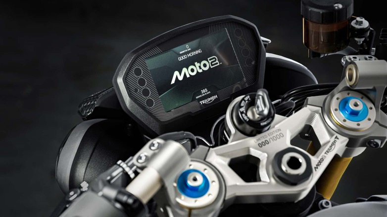 Η Moto2 Edition διατίθεται σε Mineral Grey, ενώ η Crystal White έκδοση συνοδεύεται από ένα έντονο κίτρινο Triumph Performance υποπλαίσιο και αντίστοιχη γραμμή στη ζάντα πίσω τροχού, κάτι που για κάποιους ίσως δικαιολογεί την επιπλέον τιμή.