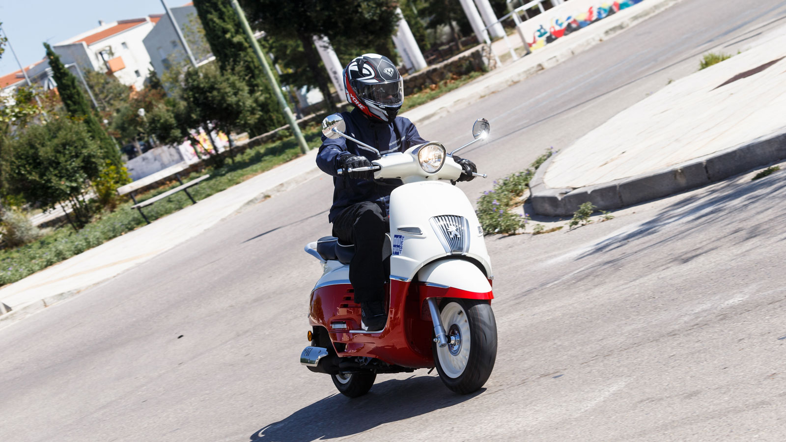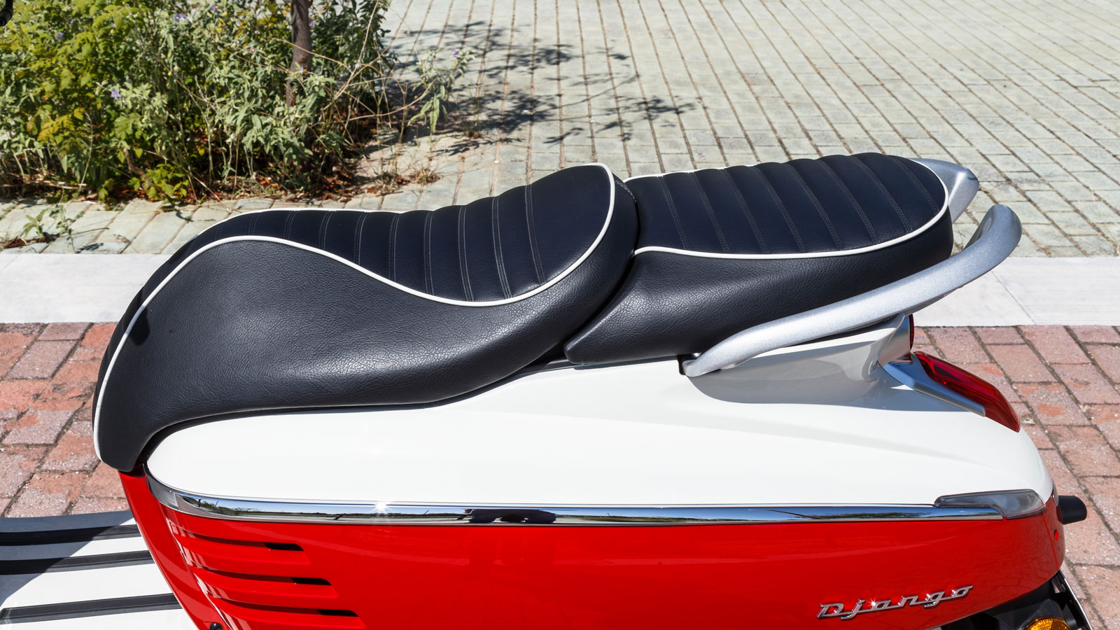 Η αλήθεια είναι πως στην πρώτη μας γνωριμία πήραμε λίγο χρόνο θαυμάζοντας τη σιλουέτα του Django και ανακαλύπτοντας τις όμορφες σχεδιαστικές λεπτομέρειες που το κάνουν να ξεχωρίζει από ό,τι άλλο κυκλοφορεί στο δρόμο. Ανεβαίνοντας στη φιλόξενη σέλα, ο διαθέσιμος χώρος και η σωστή εργονομία παραπέμπουν σε scooter μεγαλύτερης κατηγορίας και κανείς δεν θα αισθανθεί στριμωγμένος. Γυρίζοντας το κλειδί και πατώντας το κουμπί της μίζας, ο κινητήρας ξεκινά και λειτουργεί πρακτικά χωρίς κραδασμούς με τα επίπεδα θορύβου να παραμένουν χαμηλά. Ανοίγοντας το γκάζι η απόκριση της μετάδοσης είναι άμεση και δεν χρειάζονται πολλές στροφές προκειμένου το Django να αρχίσει να κινείται. Το μονοκύλινδρο σύνολο είναι εύστροφο με την ισχύ να περνά γραμμικά στο δρόμο. Τα πρώτα 50 χλμ./ώρα έρχονται σβέλτα σε 5,9 δευτερόλεπτα, αλλά από εκεί και πάνω το αυξημένο βάρος για τα δεδομένα της κατηγορίας (135 κιλά) έχει επίπτωση στις επιδόσεις, καθώς απαιτούνται συνολικά 17,1 δευτερόλεπτα για το 0-80 χλμ./ώρα.