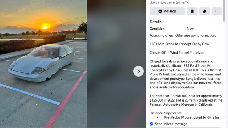 Ο πωλητής δέχεται προσφορές στο Facebook Marketplace και αν δεν του αρέσουν, θα πραγματοποιήσει δημοπρασία. Πάντως ένα άλλο Ford Probe Concept, το οποίο όμως διέθετε 1,6 λίτρων turbo κινητήρα 122 ίππων, είχε πουληθεί για 125.000 δολάρια το 2022 και πλέον είναι έκθεμα σε μουσείο.