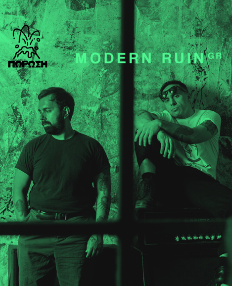 Οι Modern Ruin δημιουργήθηκαν στο Βερολίνο από τον Νίκο Ράπτη (Fringe Society/f0ment) και τον Μάκη Παπασημακόπουλο (ex Rattler Proxy). Με ήχο που ισορροπεί ανάμεσα στο krautrock, το σκοτεινό synthwave και την club κουλτούρα, το σχήμα δημιουργεί υποβλητικά, επαναληπτικά soundscapes με έντονο industrial χαρακτήρα και αναλογική ατμόσφαιρα. Το ντεμπούτο άλμπουμ τους, Unemployment Line Disco, κυκλοφόρησε από την επιδραστική σουηδική δισκογραφική Höga Nord Rekords, ενώ το follow up EP τους στην Lurid Music με τίτλο Flesh βρήκε το σχήμα να φιλτράρει τον ήχο του μέσα από το remix του Gabe Gurnsey στο Echoes of Blood. Στην παρούσα φάση του, το σχήμα ολοκλήρωσε το δεύτερο LP του με τίτλο Oubliette και συνεχίζει να πειραματίζεται με την υπαρξιακή του μελαγχολία κάπου σε ένα μικρό στούντιο του Βερολίνου.