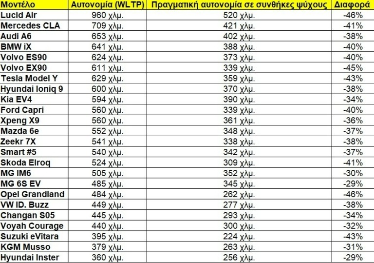 Αντίστοιχα, η Mercedes-Benz CLA διένυσε 421 χλμ. δηλαδή κατά 41% λιγότερα από τα 709 χλμ. της μέγιστης τυποποιημένης (κατά «WLTP»). Άλλα μοντέλα που σημείωσαν καλή πραγματική επίδοση στις συνθήκες ψύχους ήταν τα Audi A6 e-tron (402 χλμ.), BMW iX (388 χλμ.) και Volvo ES90 (373 χλμ.), αντίστοιχα.