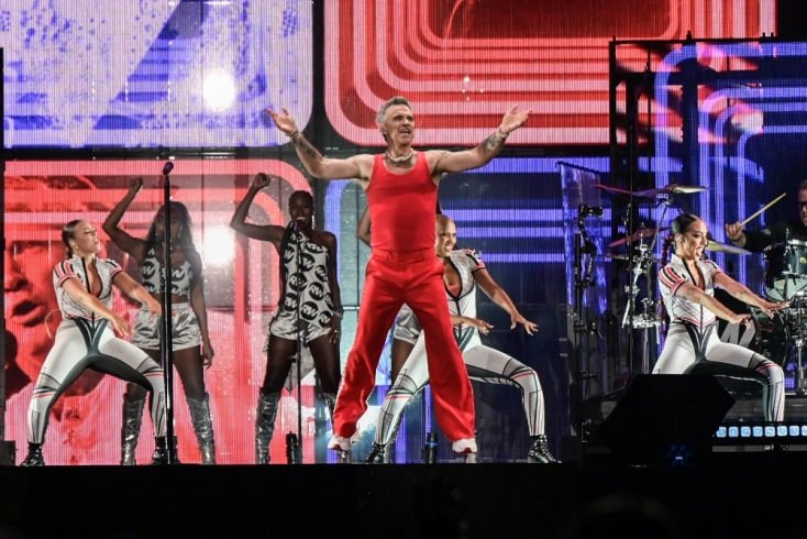 Ανάμεσα στα τραγούδια δεν κάνει παύσεις. Δίνει μικρές παραστάσεις. Ο Ρόμπι ξέρει να γεμίζει τον χώρο με stand-up ρυθμό. «Ξεχάστε να φαίνεστε κουλ. Ξεχάστε να θέλετε να φαίνεστε κουλ. Συνδεθείτε. Βγάλτε έξω τις cringe σημαίες σας», λέει με εκείνο το πονηρό του βλέμμα. Και λίγο μετά πετά την ατάκα: «26 χρόνια πριν έκανα σεξ με μια φαν σε συναυλία». Στρέφεται σε έναν άντρα με μούσι στην πρώτη σειρά και προσθέτει: «Τώρα έχει μούσι». Το στάδιο ξεσπά σε γέλια- μία από τις πολλές φορές. Αυτές οι στιγμές, μαζί με την ακατάβλητη σκηνική του ενέργεια, είναι που δε σε αφήνουν να πιάσεις το κινητό σου λεπτό- και αυτό στις μέρες μας το λες και μεγάλη επιτυχία.