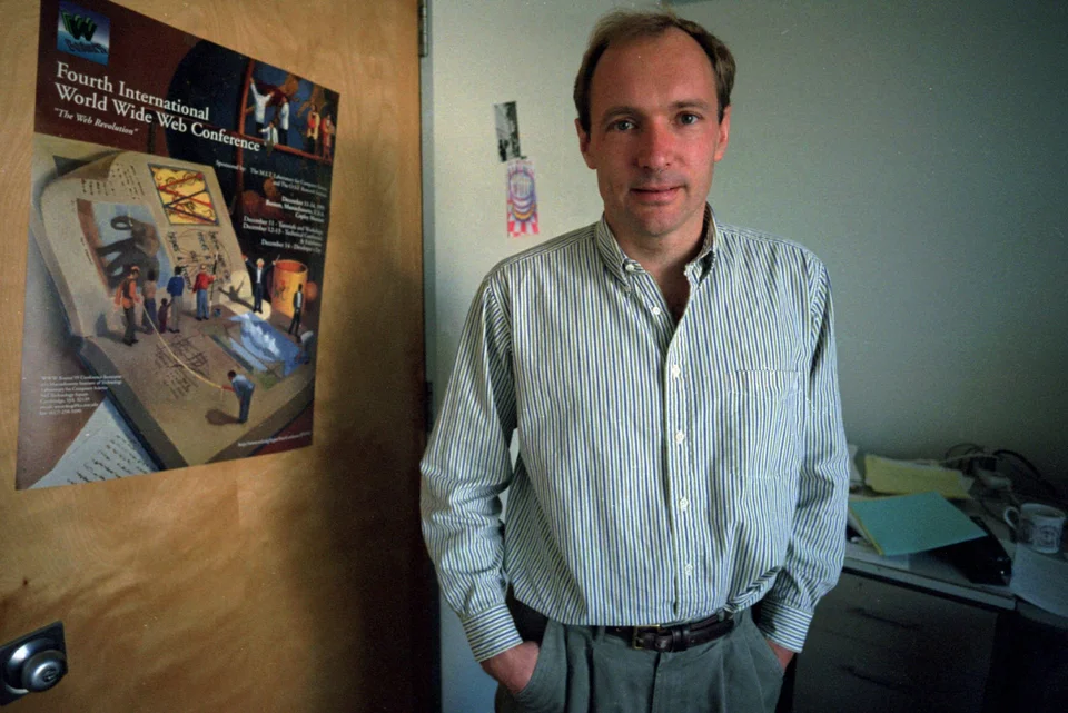 Ο Τιμ Μπέρνερς-Λι, ο άνθρωπος που εφηύρε τον Παγκόσμιο Ιστό του Διαδικτύου, ποζάρει στο γραφείο του στο Ινστιτούτο Τεχνολογίας της Μασαχουσέτης στις 2 Οκτωβρίου 1995, στο Κέιμπριτζ της Μασαχουσέτης.