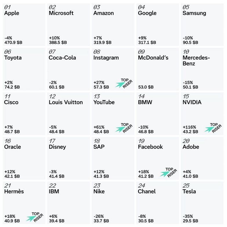 Με τα παραπάνω κριτήρια, οι πιο πολύτιμες μάρκες ήταν η Apple (470,9 δισεκατομμύρια δολάρια), η Microsoft (388,5 δισεκατομμύρια δολάρια) και η Amazon (319,9 δισεκατομμύρια δολάρια). Ωστόσο, μας ενδιαφέρουν τα αυτοκίνητα, όπου η Toyota ήταν η πιο πολύτιμη αυτοκινητοβιομηχανία και κατέλαβε την 6η θέση συνολικά. Η αξία της ανέρχεται σε 74,2 δισεκατομμύρια δολάρια, αύξηση 2% σε σχέση με πέρυσι. Η Mercedes ακολουθεί από κοντά στην 10η θέση με αποτίμηση 50,1 δισεκατομμυρίων δολαρίων ενώ σοκ προκαλούν τα στοιχεία για την Tesla. Η μετοχή της έπεσε κατακόρυφα κατά 35%, στα 29,5 δισεκατομμύρια δολάρια.