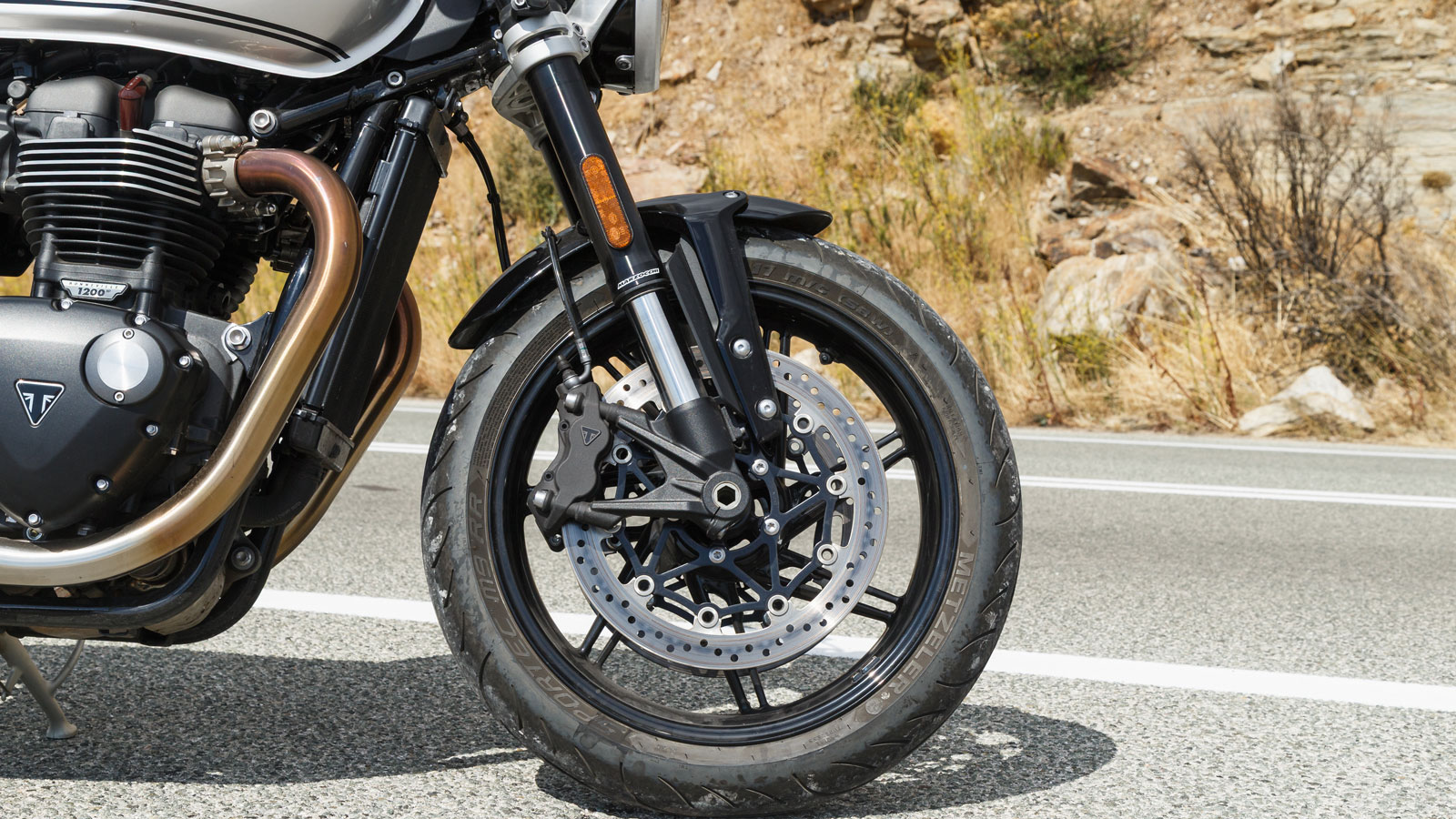 Το ατσάλινο σωληνωτό πλαίσιο του Speed Twin 1200, έρχεται αυτούσιο από το προηγούμενο μοντέλο, που χρησιμοποιούσε ως βάση αυτό της Thruxton, με νέο όμως υποπλαίσιο και ανοδιωμένο αλουμινένιο ψαλίδι. Στον τομέα των αναρτήσεων έχουμε νέο “hardware”, αφού το ανεστραμμένο πιρούνι 41 χιλιοστών της KYB αντικαθιστά ένα 43 χιλιοστών της Marzocchi, ενώ και τα διπλά αμορτισέρ πίσω προέρχονται επίσης από την ιταλική εταιρεία, έχουν ξεχωριστό δοχείο αζώτου και ρυθμιζόμενη προφόρτιση. Οι διαδρομές τους είναι στα 120 και 116 χιλιοστών αντίστοιχα και παρά το γεγονός ότι δεν προσφέρουν ιδιαίτερη δυνατότητα ρύθμισης, κάνουν εξαιρετικά τη δουλειά τους. Κρατώντας το κόστος σε χαμηλότερα επίπεδα για την βασική έκδοση, οι Brembo δαγκάνες εμπρός έχουν αντικατασταθεί με Nissin 4 εμβόλων, με τους ίδιους δίσκους 320 χιλιοστών και πίσω υπάρχει ένας δίσκος 220 χιλιοστών με διπίστονη δαγκάνα της Nissin. Παρά την αλλαγή αυτή όμως η πέδηση έχει βελτιωθεί όπως διαπιστώσαμε στις μετρήσεις μας. Δίπλα στην βασική έκδοση, προστίθεται για το 2025 και η έκδοση RS, η οποία αποκτά Brembo Stylema monoblock δαγκάνες εμπρός και πλήρως ρυθμιζόμενα αμορτισέρ της Öhlins πίσω με διαδρομή 123 χιλιοστά. Το Cornering ABS λειτουργεί εξαιρετικά, κρατώντας τον αναβάτη ασφαλή ακόμα και με τη μοτοσυκλέτα σε κλίση, ενώ οι αλουμινένιες 17” ζάντες, ντύνονται με τα Metzeler Sportec M9 RR, σε διαστάσεις 120/70-17 εμπρός και 160/60-17 πίσω. Το βάρος της μοτοσυκλέτες πλήρης υγρών παραμένει στα 216 κιλά και το μεταξόνιό της στα 1.413 χιλιοστά (+1 για την έκδοση RS).