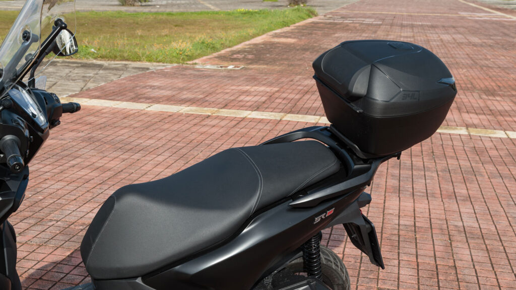 Η εργονομία ολοκληρώνεται με μια στιβαρή σχάρα αποσκευών και top case 34 λίτρων, της GIVI, ειδικά σχεδιασμένο για το SR16, ενισχύοντας τον καθημερινό χαρακτήρα του μοντέλου.