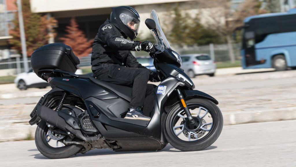 Στο καθημερινό φάσμα 30-80 χλμ./ώρα κινείται με άνεση και γραμμικότητα. Δεν παρουσιάζει ενοχλητικούς κραδασμούς και το γκάζι έχει καλή απόκριση χωρίς νευρικότητα ή κενά. Εκεί που αρχίζει να δείχνει τον περιορισμό του είναι στις τελικές ταχύτητες. Σε υψηλότερο ρυθμό παρατηρείται μια ελαφριά αστάθεια, κυρίως λόγω του μεγάλου ανεμοθώρακα που επηρεάζει την αεροδυναμική συμπεριφορά. Δεν πρόκειται για κάτι ανησυχητικό, αλλά γίνεται αντιληπτό όταν το πιέσεις κοντά στο όριο. Παρόλα αυτά η προστασία του μεγάλου ανεμοθώρακα είναι σε άλλο επίπεδο. Σε συνδυασμό με τις χούφτες δεν νιώθεις το παραμικρό σε κρύο η βροχή.